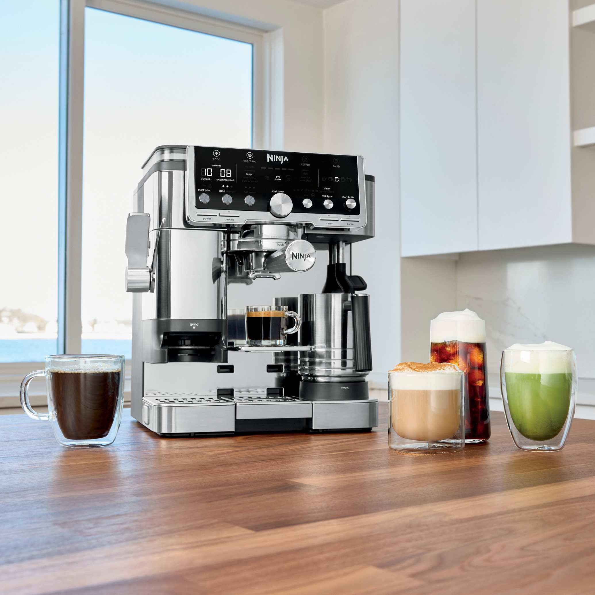 Ninja's most premium guided experience that makes espresso uncomplicated. The Ninja Luxe™ Café Pro Series is an intelligent espresso & coffee system with 4-in-1 versatility (no guesswork espresso machine, well balanced drip coffee maker, rapid cold brew creator and independent hot water system), that helps you elevate your coffee routine and create café-quality drinks at home. Create perfect pucks at the pull of a lever with the integrated tamper. Barista Assist Technology™ guides you to the perfect cup from grind size recommendations to automated brew adjustments, while the Dual Froth System Pro effortlessly creates perfectly textured microfoam hands-free. Easy-to-clean, insulated steam wand and XL Milk Jug elevate your at-home coffee routine, and create froth for two drinks with 5 preset froth functions including steamed milk, thin froth, thick froth, extra-thick froth, and cold foam.