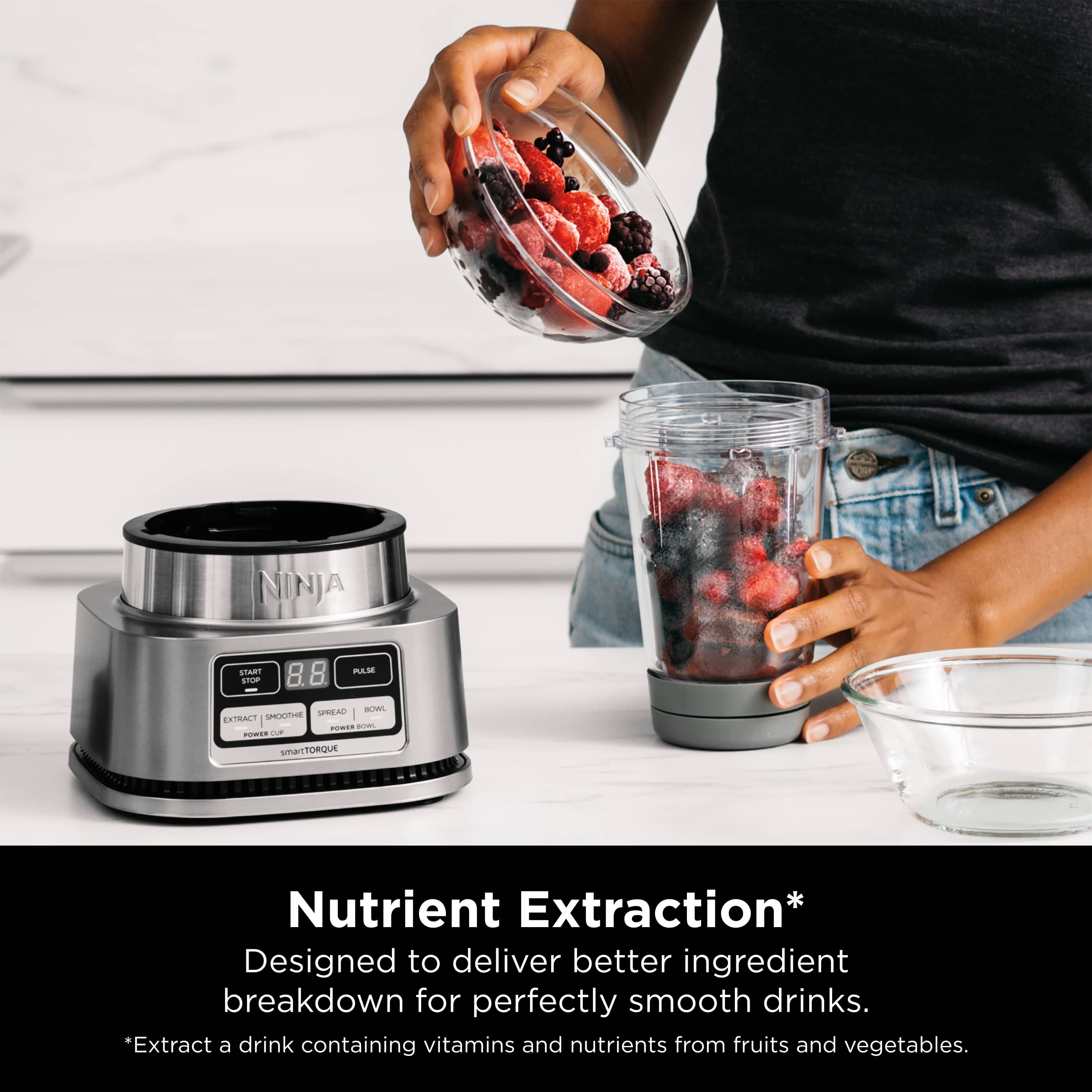 Ninja® Foodi® Smoothie Bowl Maker and Nutrient Extractor* with smartTORQUE™ blends and powers through the thickest ingredients. One base—multi-functions. Nutrient Extraction* Cup for smooth drinkables (vs. BL480). Smoothie Bowl Maker with built-in tamper powers through with less liquid for thick smoothie bowls. 1200-peak-watts.