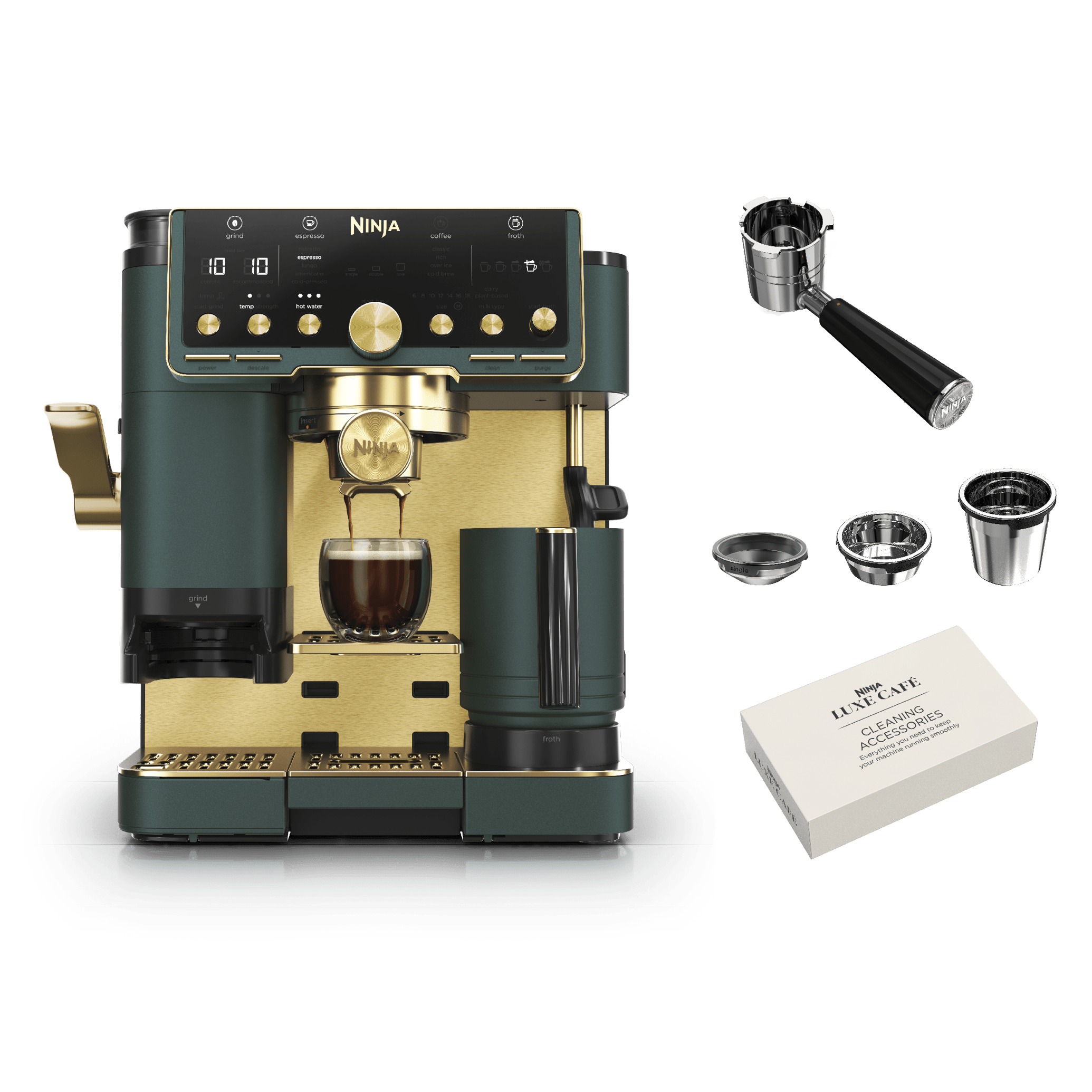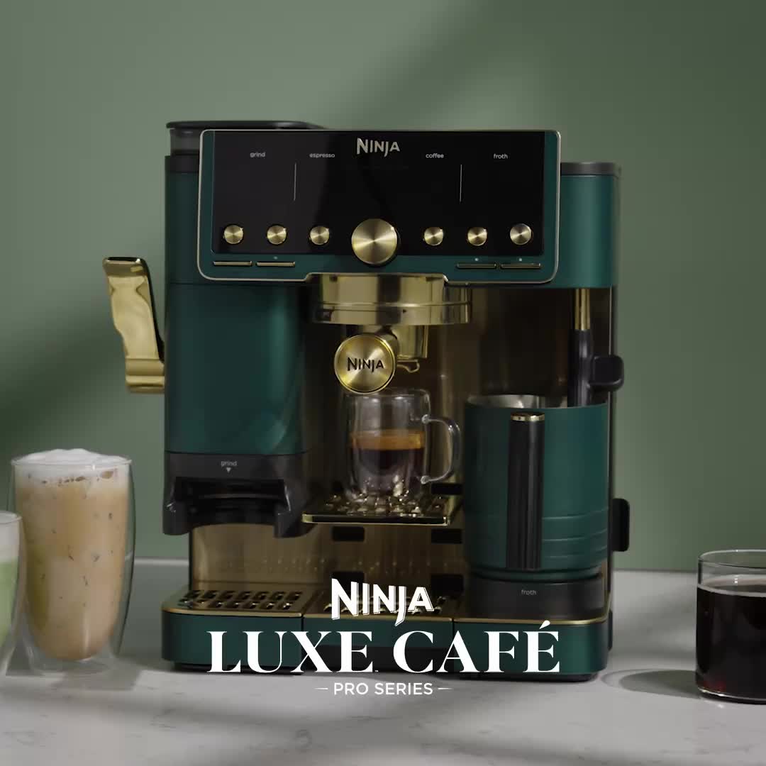 Ninja's most premium guided experience that makes espresso uncomplicated. The Ninja Luxe™ Café Pro Series is an intelligent espresso & coffee system with 4-in-1 versatility (no guesswork espresso machine, well balanced drip coffee maker, rapid cold brew creator and independent hot water system), that helps you elevate your coffee routine and create café-quality drinks at home. Create perfect pucks at the pull of a lever with the integrated tamper. Barista Assist Technology™ guides you to the perfect cup from grind size recommendations to automated brew adjustments, while the Dual Froth System Pro effortlessly creates perfectly textured microfoam hands-free. Easy-to-clean, insulated steam wand and XL Milk Jug elevate your at-home coffee routine, and create froth for two drinks with 5 preset froth functions including steamed milk, thin froth, thick froth, extra-thick froth, and cold foam.