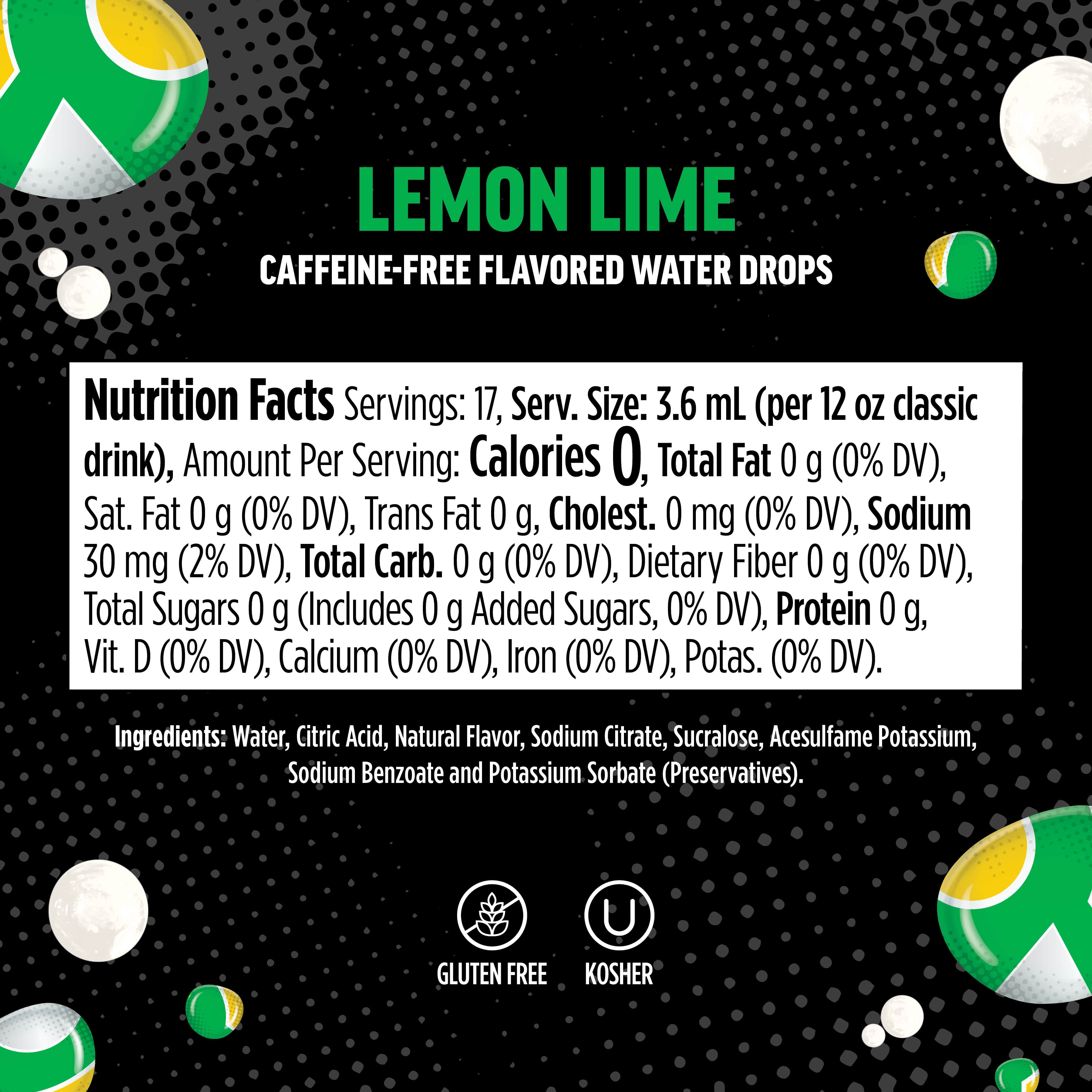 Servings: 17, Serv. Size: 3.6mL (per 12oz classic drink), Amount Per Serving: Calories0, Total Fat 0g (0% DV), Sat. Fat 0g (0% DV), Trans Fat 0g, Cholest. 0mg (0% DV), Sodium 30mg (2% DV), Total Carb. 0g (0% DV), Dietary Fiber 0g (0% DV), Total Sugars 0g (Includes 0g Added Sugars, 0% DV), Protein 0g, Vit. D (0% DV), Calcium (0% DV), Iron (0% DV), Potas. 0mg (0% DV).
