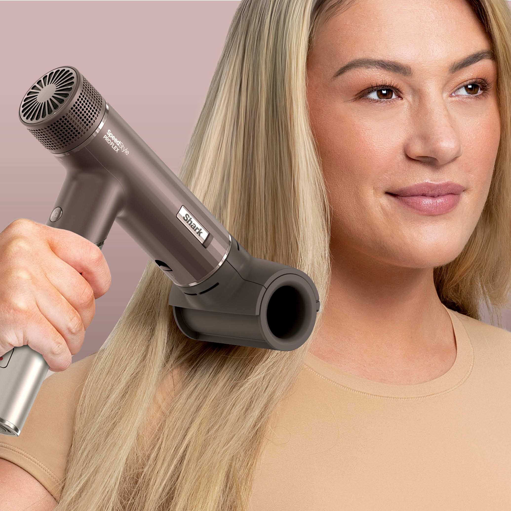 Meet Shark® SpeedStyle™ Pro FLEX High-Velocity Hair Dryer System. Designed with professional performance in a compact, flex design without compromising power. Get salon-quality blowouts, defined curls, & high-gloss shine at home with high-velocity airflow reaching 100 mph in under a second, with no heat damage. Includes Scalp Shield — designed to protect new hair growth from extreme heat.