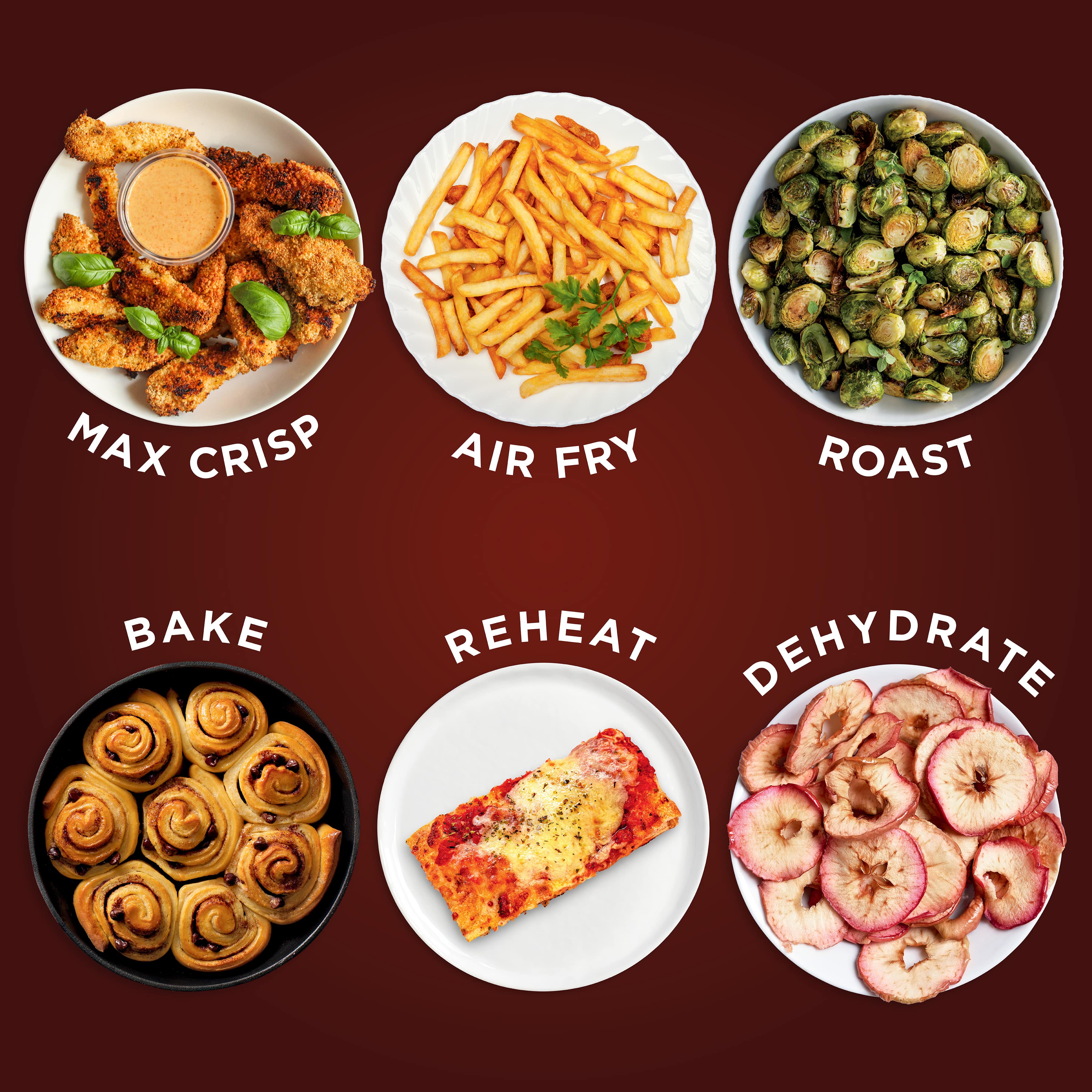 - 6-in-1 FUNCTIONALITY: Max Crisp, Air Fry, Air Roast, Bake, Reheat, and Dehydrate