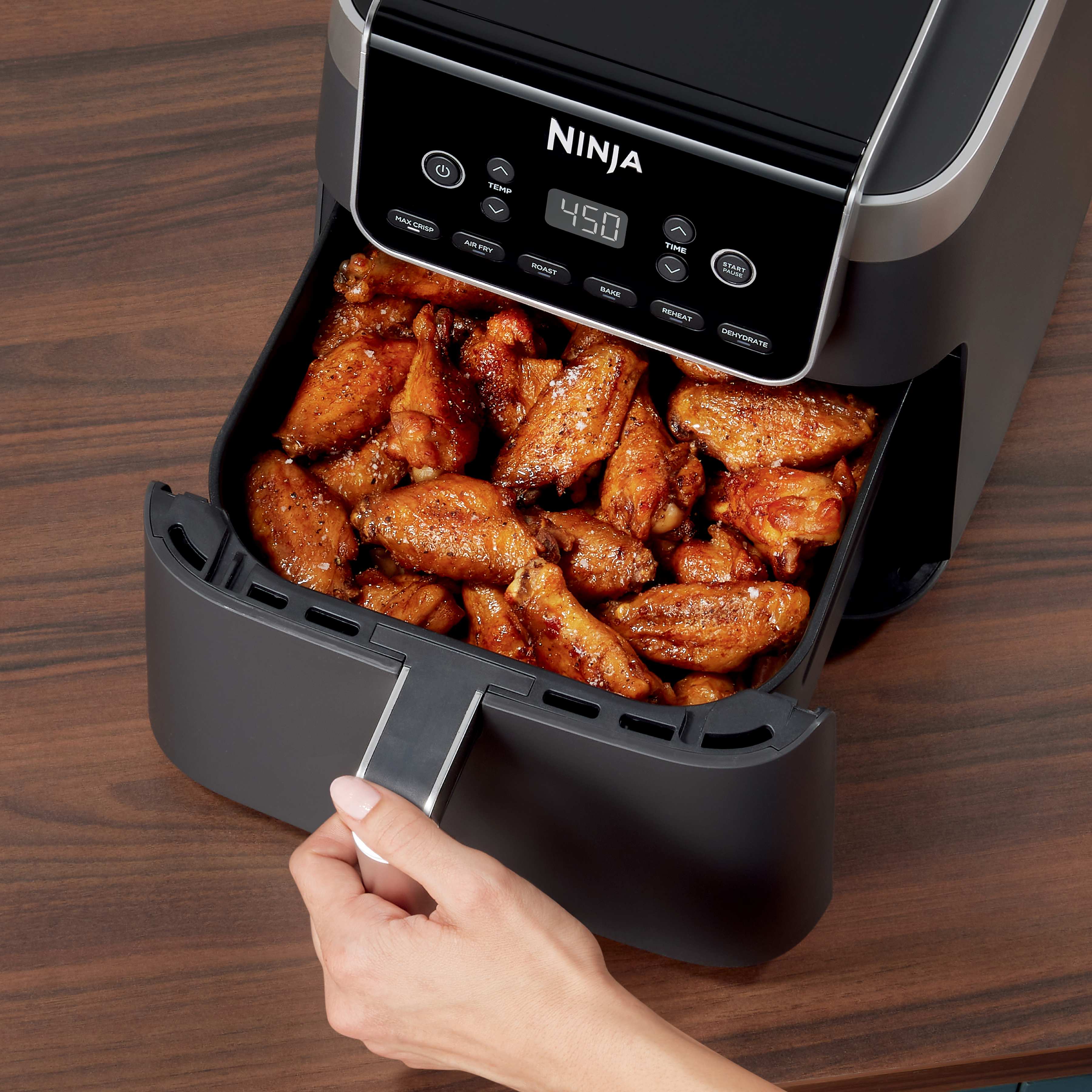 Meet the Ninja® Air Fryer Pro XL, a fast and easy way to get the perfect crisp with up to 450F of heat. MaxCrisp Technology surrounds your favorite foods with superheated air for hotter, crispy results. Cook up to 9 lbs (6.5 QT) of wings using little to no oil and enjoy your favorite foods guilt-free. With 6 cooking functions, you can satisfy any craving, from crispy snacks to full meals. Cleanup is a breeze with a nonstick and dishwasher-safe crisper plate and basket.