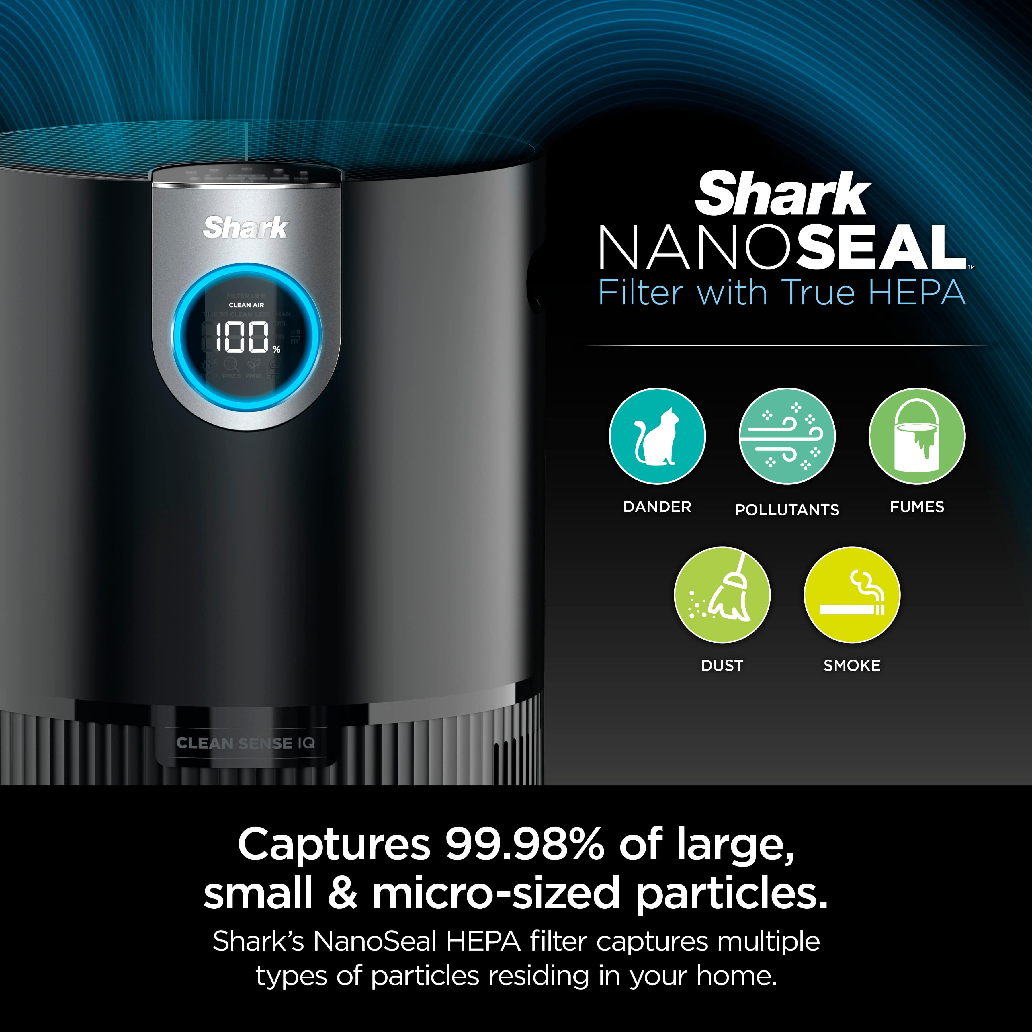 The Shark Air Purifier MAX uses Pure Air MicroForce to deliver fast, powerful, and quiet purification in a compact size. Clean Sense IQ automatically improves your air quality and reports results in real time. A HEPA filter captures 99.98%* of airborne particles like allergens,** dust, and dander.