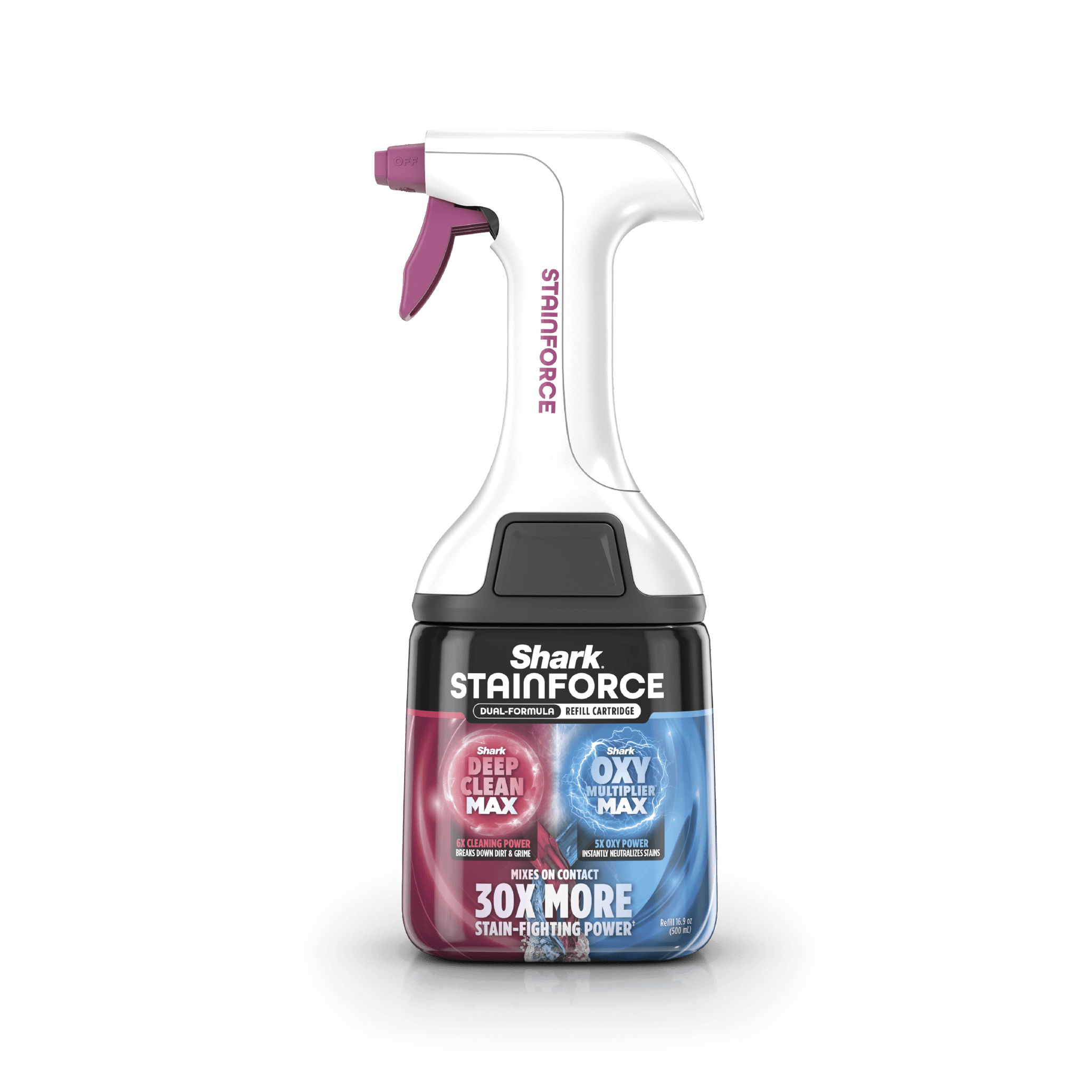 • INCLUDES: Shark Stainforce, Stain Eliminator Tool with Reversible Bristles, Squeegee Tool, Reusable StainForce Spray Head, Full-Size Dual-Formula StainForce Refill Cartridge. Grab & Go Caddy, Charging Cable