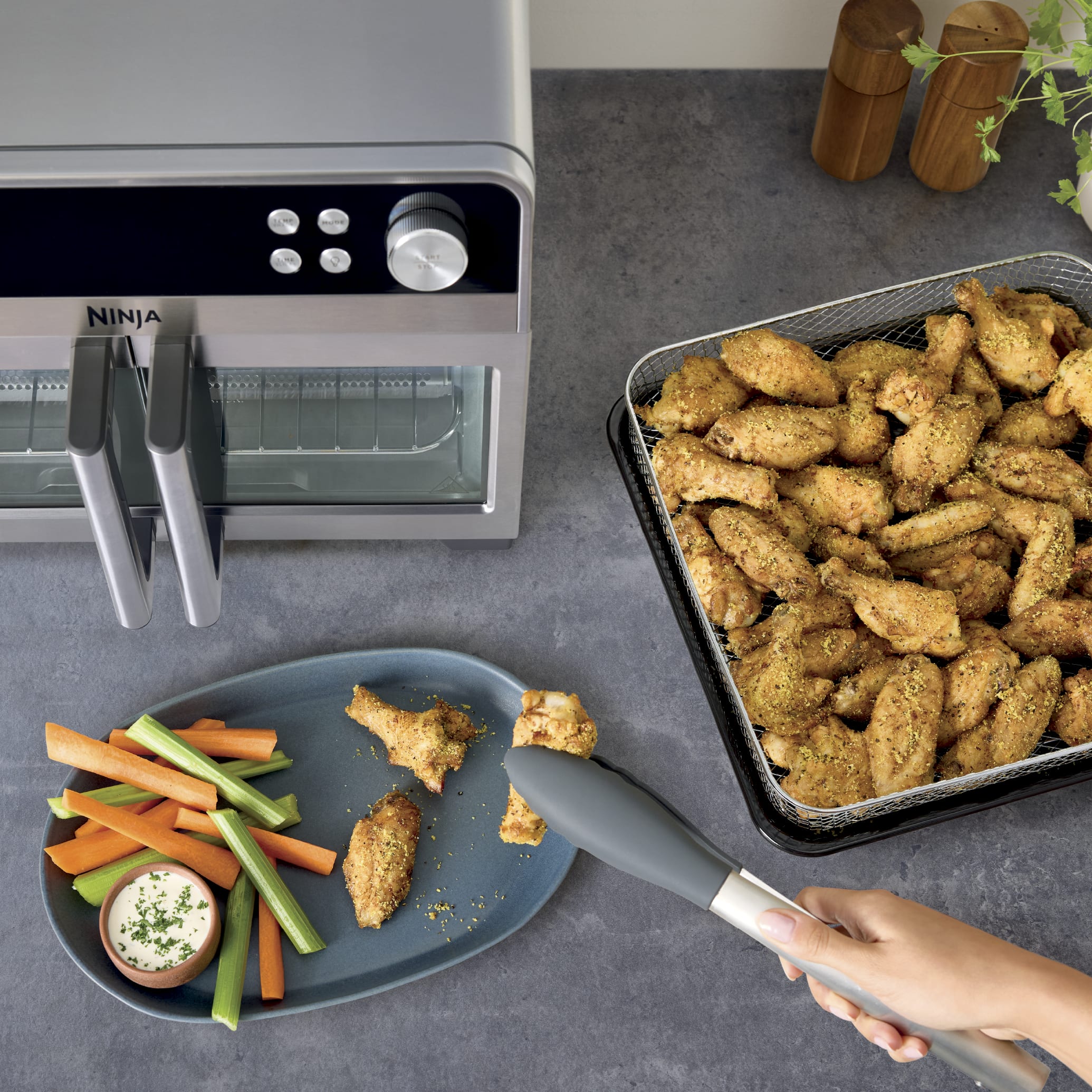 450°F Cyclonic Air Technology delivers even heat for crispy textures and 60% faster cooking*—no rotating required.
