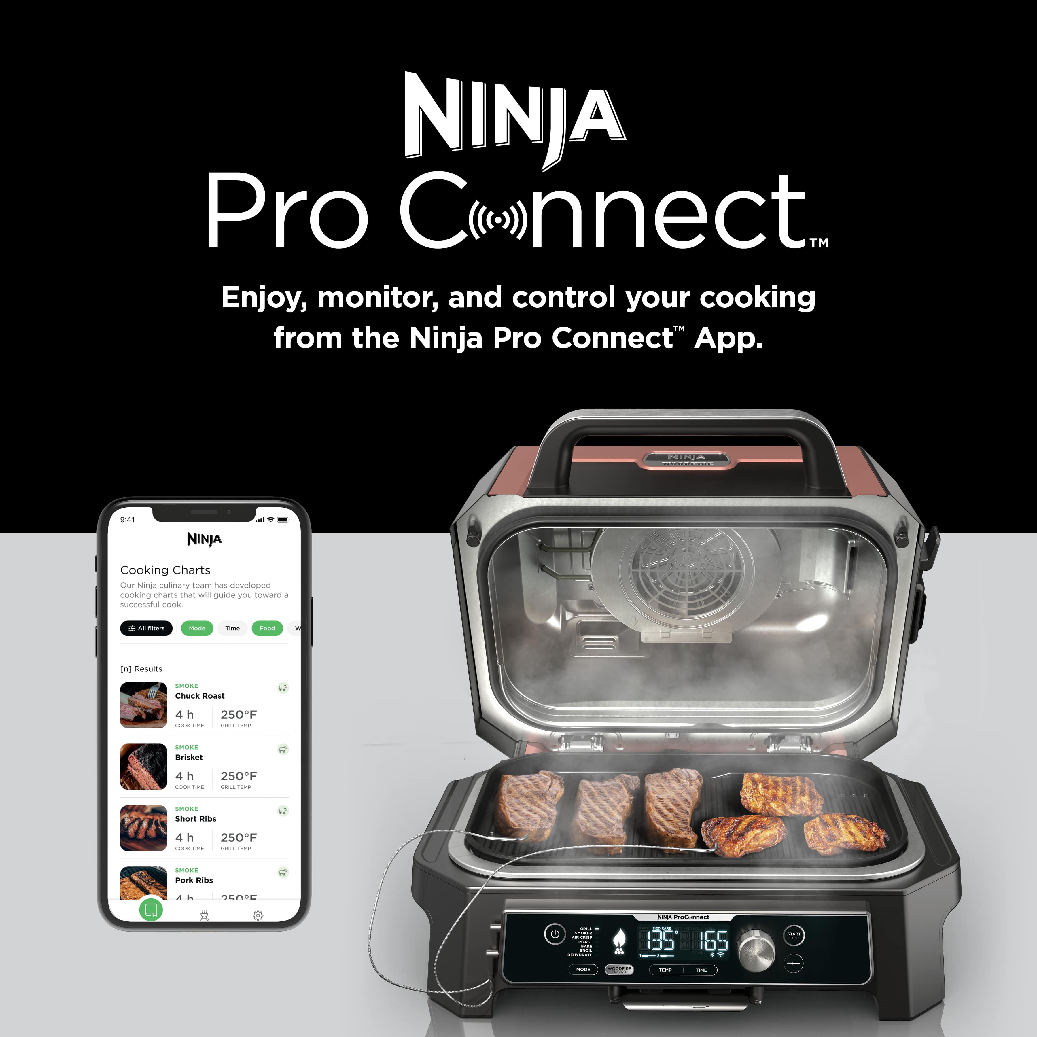 - COOK WITHOUT THE GUESSWORK: Use the Ninja ProConnect™ app to pair your grill to your phone to monitor and control cook time and temp of two different proteins, receive real-time notifications, and even access cooking charts.